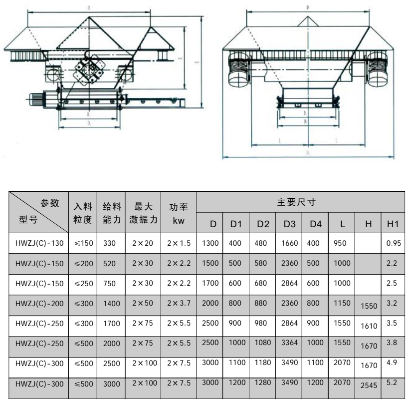 5、激振力可調(diào)范圖廣,生產(chǎn)能力大。給料量可以調(diào)節(jié),給料量范圍200T/h;