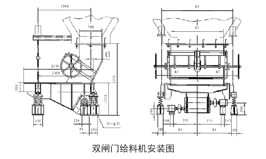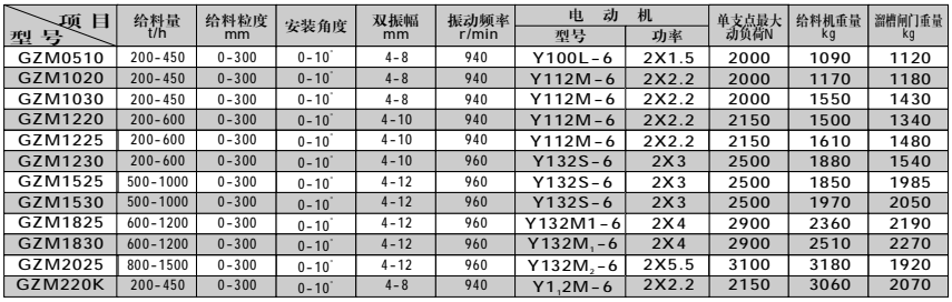 GZM型振動給料機是我公司與煤炭部選煤設計研究院聯合研制的新型給料設備。該機采用雙普通電機自同步分離拖動技術,電機不參振,采用箱式激振器,極大的簡化了激振裝置。該機具有結構簡單、處理量大、噪音小、能耗低、動負荷小、使用壽命長等特點。該機型安裝方式為前吊后座、全座、全吊、前座后吊。電機分普通和防爆型,380V和660V;電機可左右布置,也可同一側布置。專用溜槽閘門分為手動和電液自動式。
